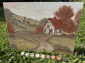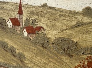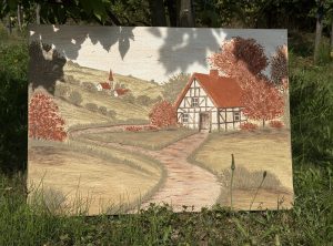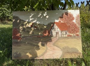 Ten obraz przed­staw­ia idyl­liczny pejzaż w sty­lu rustykalnym – wiejs­ki dom z muru pruskiego na tle łagod­nych wzgórz i pól, otoc­zony drze­wa­mi mienią­cy­mi się ciepły­mi bar­wa­mi zie­mi. W odd­ali widoczny jest koś­ciółek z czer­wonym dachem, charak­terysty­czny dla małych miejs­cowoś­ci w środ­kowej Europie.
